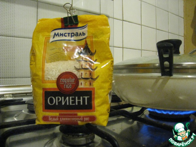 Ко всему добавляем рис, немного обжариваем его. Льем воду, чтобы только покрывало рис. Посолить. Тушим до полуготовности, пусть даже останется немножко водички, дабы в дальнейшем рис не разварился.