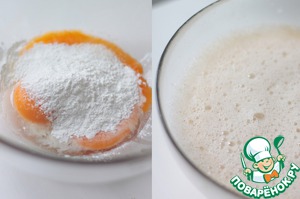 Пока готовится наш пирог, мы займемся приготовлением заварного фисташкового крема. Принцип простой - взбить 2 желтка, крахмал и ванильный сахар. Добавить маленькими порциями горячее молоко и продолжать взбивать.