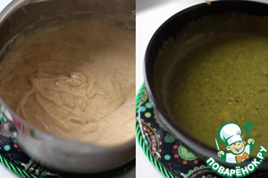 Массу вылить в кастрюльку, поставить на средний огонь и варить до загустения, постоянно помешивая. Ввести 100гр. фисташковой пасты (остальную уберите в морозилку - она отлично хранится несколько месяцев), сливочное масло и зеленый краситель. Я добавила краситель для насыщенности цвета, если вы любите все натуральное, то краситель можно не класть.