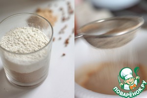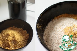 Соединяем гречневую, пшеничную муку и разрыхлитель. Просейте эту смесь в яичную массу, шелуху выкидывайте.