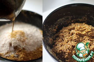 Коричневый сахар высыпать в кастрюли, добавить 30мл горячей воды и варить до состояния сиропа. Горячий сироп вылить в ореховую смесь и замешать пасту.