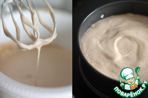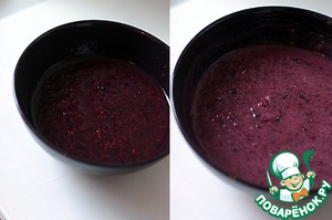 Приготовим второй крем. Замочим желатин в холодной воде, размороженную ежевику измельчим с подошью погружного блендера, соединим с желатином и немного прогреем на плите, буквально 1 минутку. Взобьем сливки до устойчивых пиков с сахаром (50г) и введем в ежевику. Отправим в холодильник остужаться.