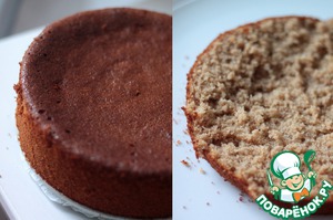 Достанем наш бисквит из духовки. Благодаря гречневой муке у него невероятный коричневый цвет. Остудим и разрежем на 3 части.