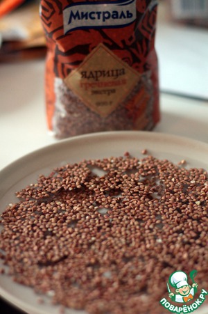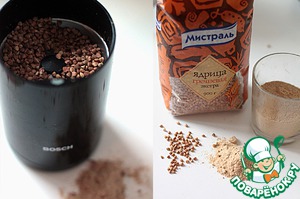 Начнем с приготовления гречневой муки. Нам нужно 100г гречки залить водой и промыть, выложить на стол и дать подсохнуть. Переложить на горячую сковороду ядра и подсушить 2-3 минутки. -