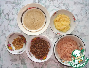 В куриное филе добавить картофель, соль и перемешать. В гречку добавить лук, перемешать.
