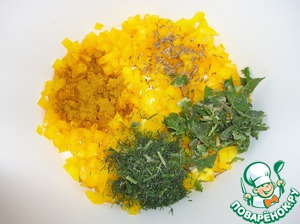 В это время готовим соус. Кто не очень почитает специи народов мира, можно обойтись и солью с перчиком. Здесь 2 варианта по болг. перцу - либо нарезать его очень мелкими кусочками, либо измельчить в блендере с остальными ингредиентами.