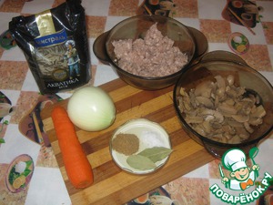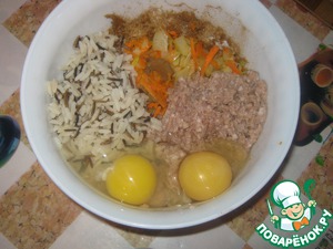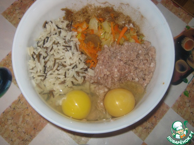 • Смешать фарш, обжаренные шампиньоны, морковь, лук, отваренный рис, 2 яйца для связки, добавить соль и приправы по своему вкусу (наличие и количество какой-либо приправы на ваше усмотрение).