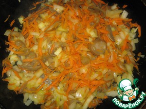 • Обжарить на сковородке резаные шампиньоны, лук и морковь до полуготовности.