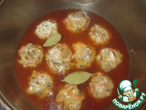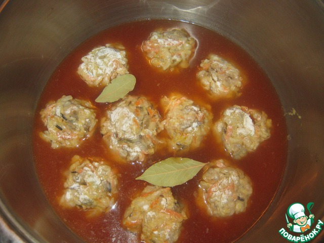 • В воде (0,5 л) растворяем 2 столовые ложки томатной пасты. Выкладываем получившиеся шарики в кастрюлю и заливаем получившимся соусом. Тушим на медленном огне 30 минут.