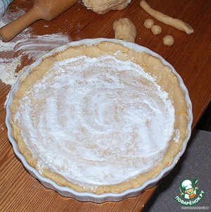 Берем широкую форму (для пиццы или тирольских пирогов), смазываем ее маслом и посыпаем сухарями. Раскатываем наше тесто в круглую лепешку чуть шире формы, оставив часть на украшение.