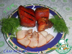 Отварить сало в воде с очень большим кол-вом луковой шелухи, ну и, конечно, подсоленной, мин 20-30, все зависит от того, какой кусок сала используем. Но варить не до мягкости, а слегка прихватить. Затем достать.