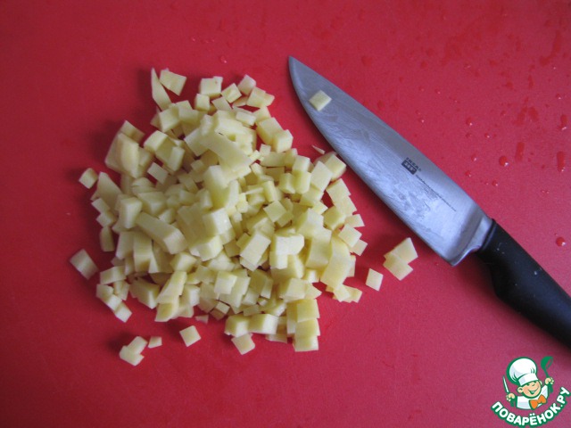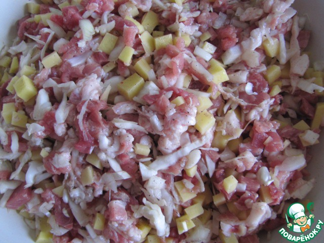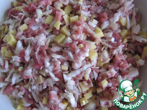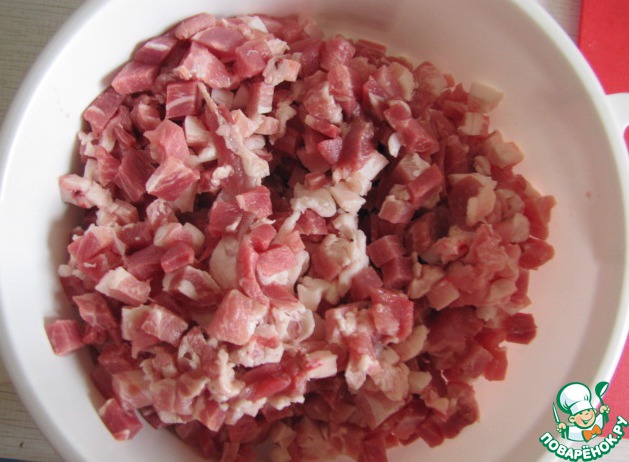 Подмороженное мясо порезать мелкими кубиками. Добавление небольшого количества сала увеличит сочность рулетов.
