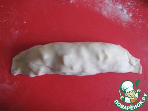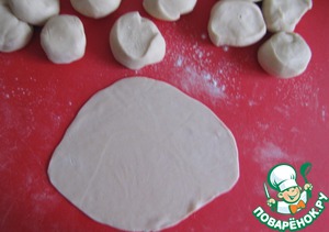 Тесто раскатать в колбаску и нарезать довольно крупными шайбочками. Кружочки очень тонко раскатать.