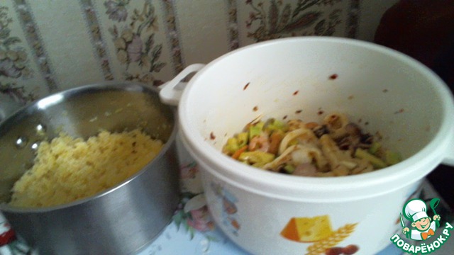 Сытный, "мужской" салат с необычайно приятным вкусом. Для тех, кто не знаком с кус-кусом это блюдо может стать приятным открытием. И любителям морепродуктов. Рецепт журнала "Гастроном. 100 лучших закусок" с некоторыми изменениями. Часто готовлю своим любимым защитникам.