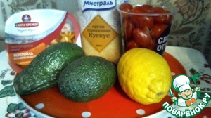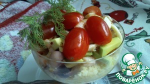 В креманку выложить часть кус-куса, сверху разложить морепродукты с авокадо, украсить половинками помидоров и сразу же подать на стол.