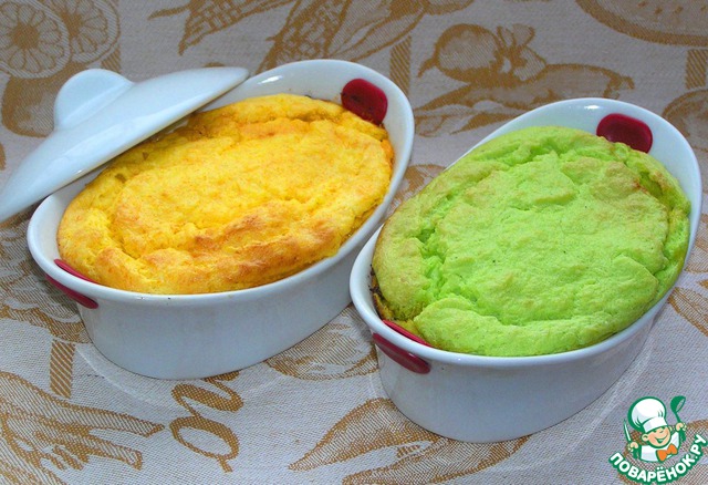 Суфле: Кашу разделить пополам. В одну часть добавить 50 г сыра, желток, морковь. Все измельчить погружным блендером.