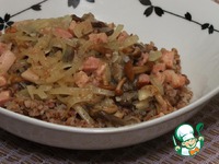 Гречка сварилась, перекладываем ее в глубокую тарелку и добавляем содержимое сковороды. Все тщательно перемешиваем и пока отставляем. |