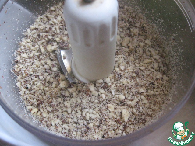 Орехи слегка поджариваем на сковороде и измельчаем в блендере (не очень мелко). Я использовала грецкие, но, думаю, с миндалем будем намного вкуснее.