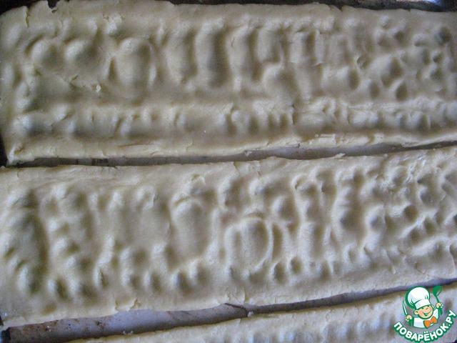 Далее пальцами делаем углубления в наших кусочках, не доходя до краев. Должно получится "корытце". Ставим в заранее разогретую до 180 градусов духовку на 10 минут.