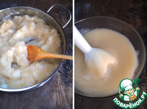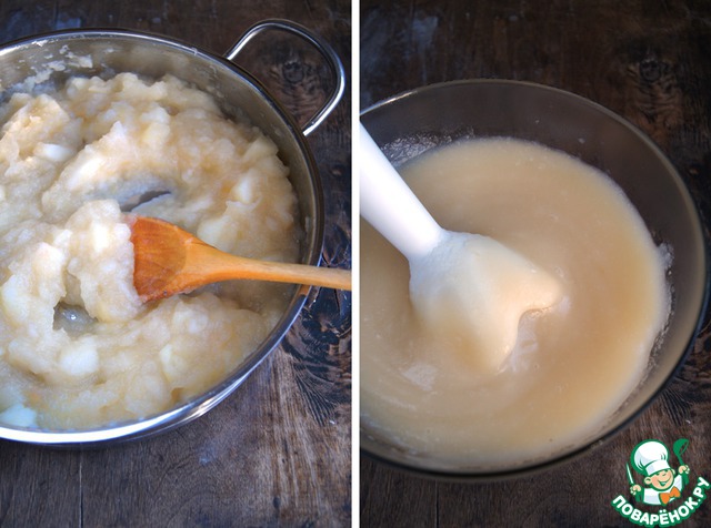 Тушёные яблоки измелчить блендером до состояния пюре.