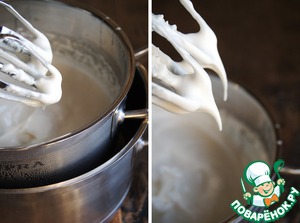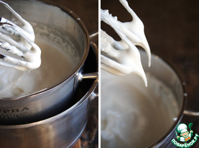Кастрюлю убрать с пара и продолжить взбивание белков до устойчивых пиков.