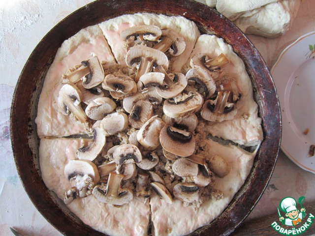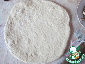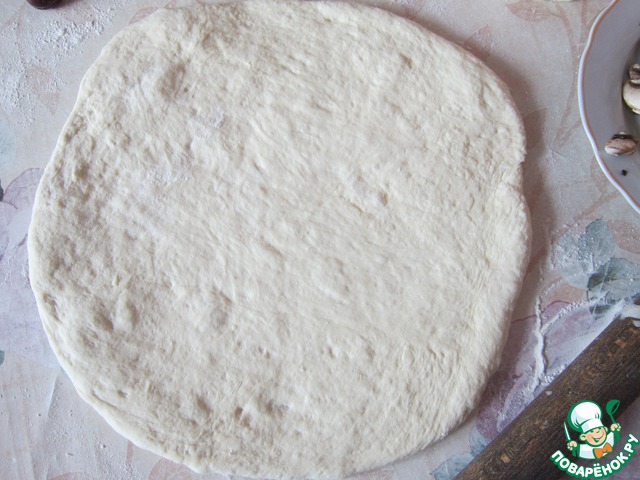 Тем временем у нас подошло тесто. Обминаем и раскатываем в форме круга.