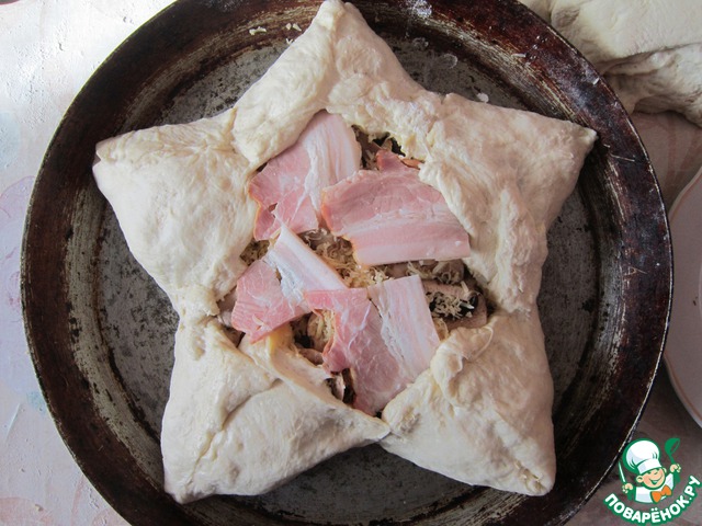 Завернуть каждый сегмент уголком, формируя звезду. В центр положить ломтики бекона. (по желанию)