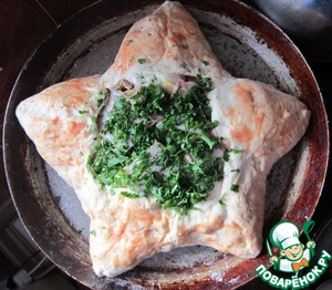 Смазать смесью из майонеза и кетчупа. Посыпать зеленью, выпекать в разогретой духовке до 220-250 градусах 25-30 минут под паром.