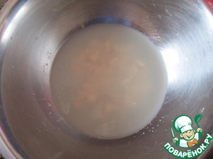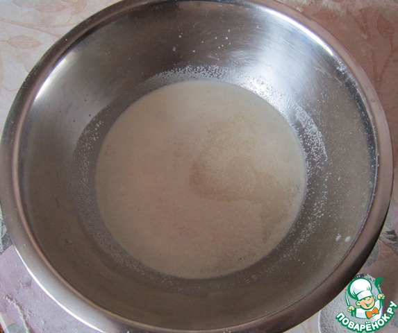 Дрожжи разламываем на маленькие кусочки, добавляем сахар, соль и заливаем теплой водой. Оставляем на 25 минут в теплом месте.