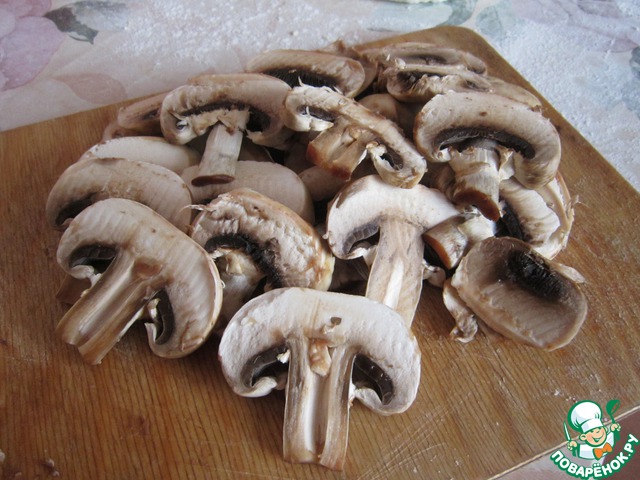 Тем временем приготовим начинку: грибы нарезаем тоненькими дольками.