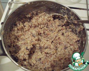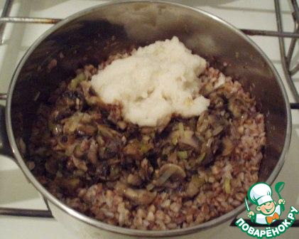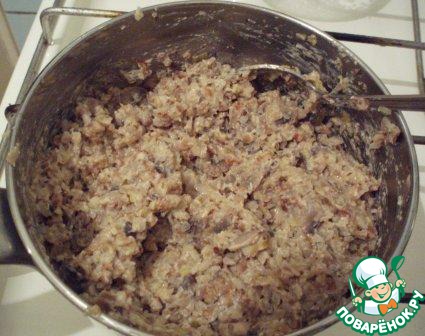 К готовой гречке добавить грибы с луком и отжатый хлеб. Все хорошо перемешать и оставить остужаться.