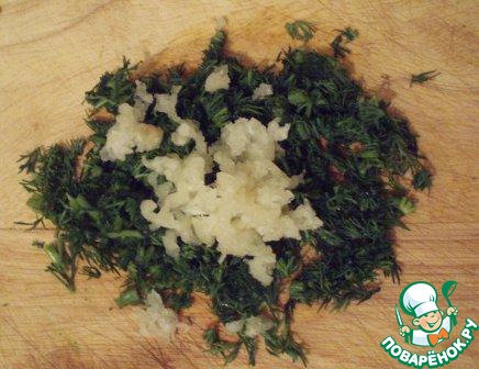 Для приготовления чесночного соуса необходимо укроп мелко порезать, чеснок пропустить через чеснокодавилку. Все смешать со сметаной.