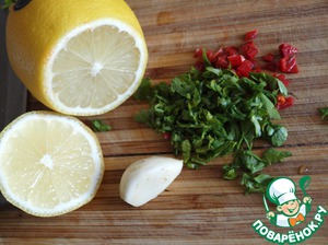 Нарезаем мелко перец чили, выдавливаем через пресс чеснок, добавляем нарезанную петрушку и лимонный сок с оливковым маслом.