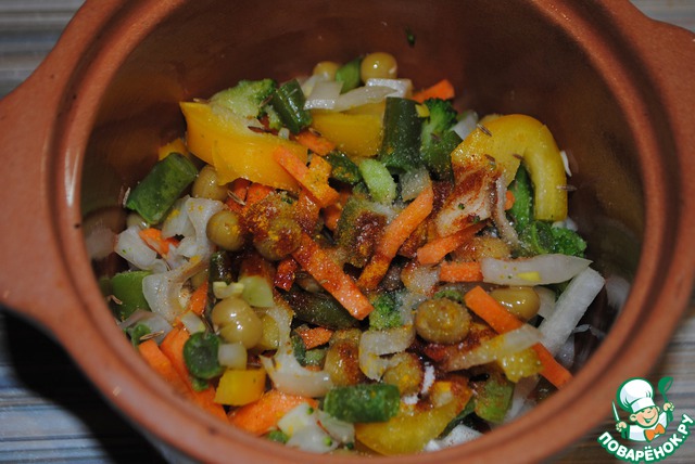 Кладем в горшочек овощи любые, у меня были и свежие, и замороженные, и даже консервированные. Сыпем приправу, добавляем растительное масло.