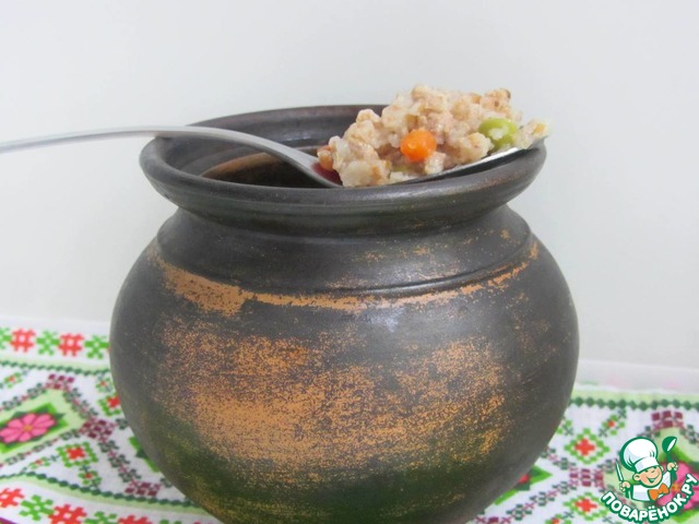 Заливаем кипятком. Накрываем крышкой, убираем в духовку на 1 час при 180*С.