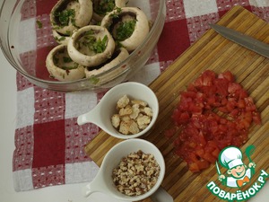 Шампиньоны хорошо моем, отрезаем ножки и вычищаем серединку, чтоб получились довольно вместительные чашечки. Затем мы их маринуем по вот этому рецепту http://www.povarenok .ru/recipes/show/713 55/