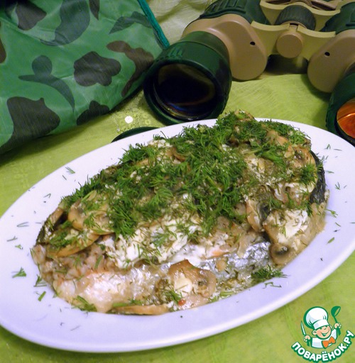 Достаем готовую рыбку и аккуратно разворачиваем. Настаиваю - АККУРАТНО, так как при открытии конверта оттуда вырывается очень горячий пар, который может обжечь пальцы. Выкладываем на блюдо, не забыв про все выделившиеся соки.