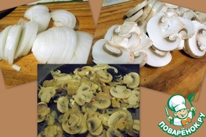Пока варится каша, займемся остальными приготовлениями. Лук очистить и нарезать полукольцами. Грибы промыть и нарезать пластинами. Чеснок измельчить. Обжарим в небольшом количестве растительного масла лук с чесноком до прозрачности, добавим грибы. Не забудем на этом этапе посолить, поперчить и добавить специи по вкусу - грибы впитают все вкусы-ароматы, что только улучшит блюдо.