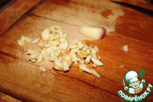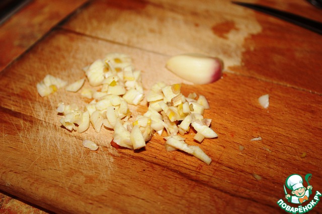 Измельчите чеснок, смешайте с рисом. Добавьте столовую ложку растительного масла, посолите, поперчите по вкусу. Перемешайте.