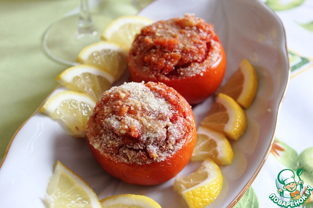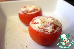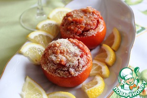Помидоры наполните полученным фаршем. Посыпьте панировочными сухарями, сбрызнете маслом и запекайте в духовке 45 минут при температуре 200 градусов.