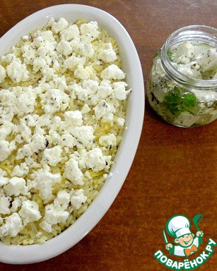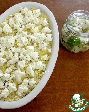 Сверху присыпать фетой, душистыми травками, слегка полить оливковым маслом.