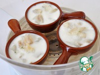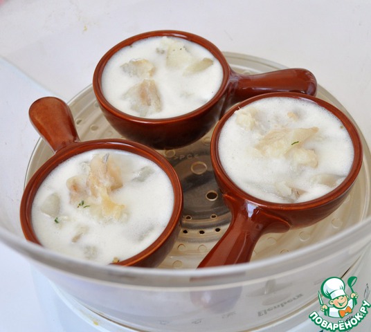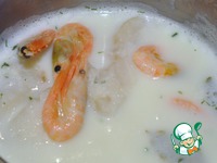 Залить молочным кремом и поставить в пароварку на 10-15 минут. Украсить креветками ( предварительно очистив их, отавить панцырь только на хвостике)
