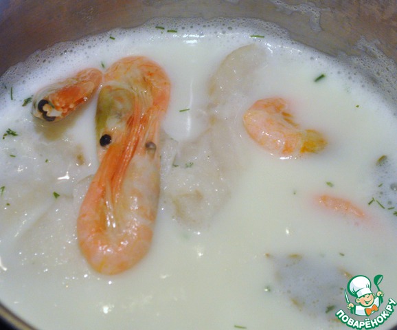 Отварить рыбу в кипящем молоке с лавровым листом и перцем горошком. В конце варки опустить на 2 минуты креветки. Посолить по вкусу.