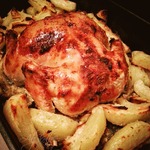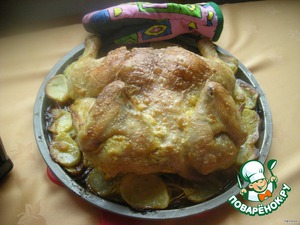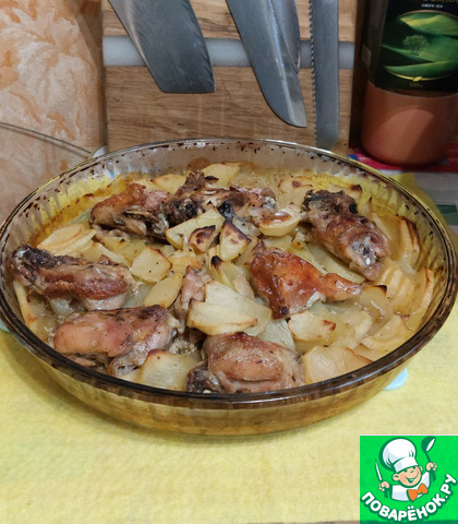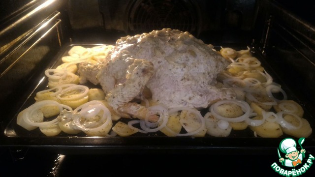 Готовил по Вашему рецепту с небольшими изменениями: у меня была грудка с кожей, которую разрезал на 4 части, вместо майонеза и чеснока взял готовый чесночный соус (тоже типа майонеза) от "Моей семьи", в соус добавил чайную ложку молотого сладкого красного перца, имбиря и тимьяна.А вместо картофеля нарезал кислое яблоко толщиной около сантиметра. А молодой картофель (уже продается такой) отварил в мундире и просто подал отдельно, не "раздевая". Получилось удивительно как вкусно.