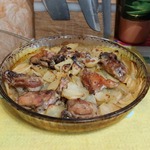 2 ) На протвень выкладываем так: картошка (порезанная кругляшками), слой лука (кольцами или полукольцами), курица в соусе.
