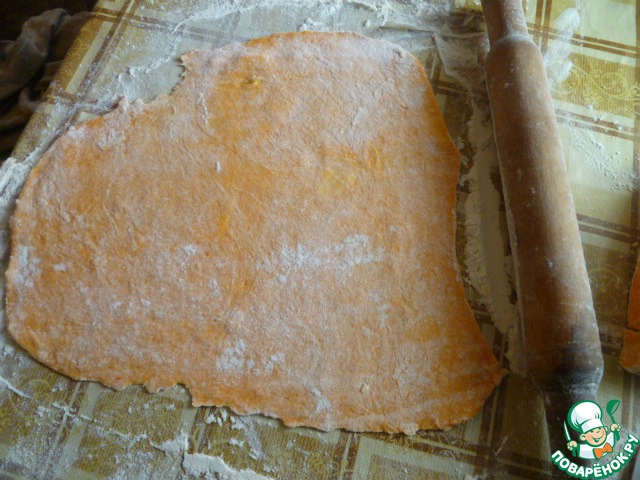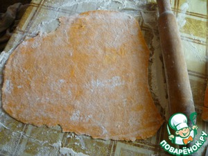 Разделить тесто на части. Чем меньше будет каждый кусочек теста, тем удобнее будет его раскатывать. Тонко раскатать на посыпанном мукой столе.