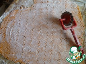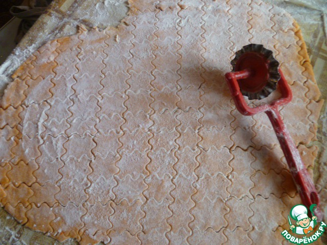 Я нарезала на квадратики с помощью вот такого ножика. Сверху посыпать мукой и рукой разгладить по всему пласту теста.