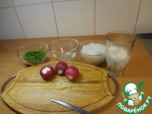 Пока варится рис, порубить укроп, порезать редис, оставив 1 шт. для украшения, мелко порубить зубок чеснока, выжать лимонный сок.