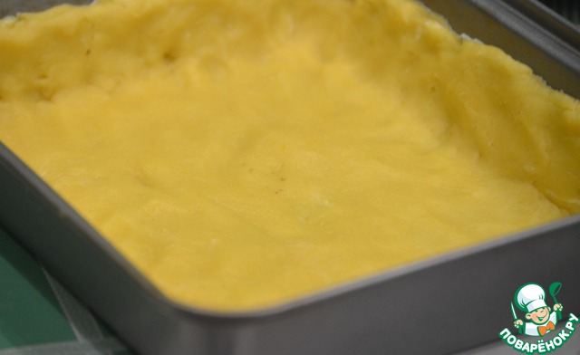 Тесто раскатать в пласт толщиной 1 см, уложить в форму, прижать ко дну формы, наколоть вилкой. (поверх теста положить пергамент и насыпать фасоль). Корж выпекать в духовке 180С 15 мин. Затем бумагу с фасолью убрать и печь еще 5 мин.