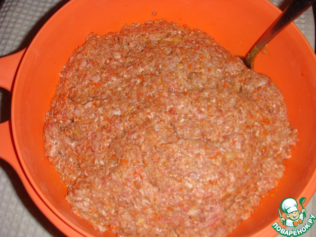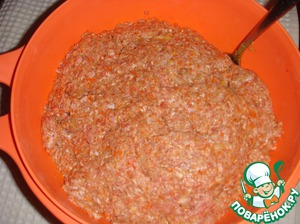 Соединить с пропущенными через мясорубку или измельченными в блендере репчатым луком и морковью. Ни в коем случае морковь не тереть на терке!